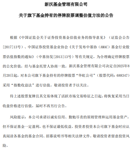 中国经济网络北京,8月21日,Xinwo Fund Management Co.,Ltd。宣布了有关调整长期暂停行动的基金估值价格的广告。该公告由Xinwo Fund Management Co.,Ltd。表示,它决定使用“指数收入方法”来评估暂停的行动“ Huahong Company”(行动守则:688347),该行动来自2025年8月20日的基金。从以前的行动恢复贸易和交易的日期反映了活动市场的谈判特征,估值将使用当天的收盘价恢复,此时将不再进行广告。